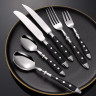 Набор столовых приборов Folk отличается своим оригинальным дизайном. Каждый прибор имеет характерные ручки черного оттенка, украшенные светлыми точками-заклепками, что придает им винтажный или кантри-стиль.