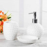Размеры: высота диспенсера – 15 см, диаметр – 9 см, длина мыльницы – 11 см.