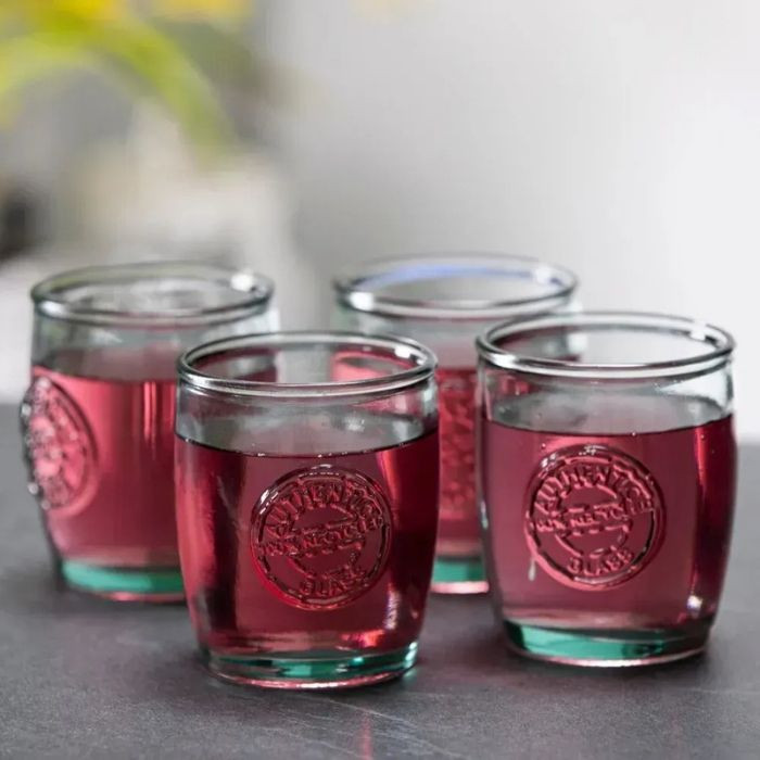 Этот набор из четырех стаканов "AUTHENTIC BAJO" подчеркивает красоту простоты и экологичности. Каждый стакан имеет приземистую, слегка бочкообразную форму и украшен характерным рельефным круглым тиснением с надписью "AUTHENTIC 100% RECYCLED GLASS", что свидетельствует об использовании переработанного стекла и придает рустикальный шарм. Эти стаканы идеально подходят для подачи воды, соков, коктейлей или как универсальные стаканы для повседневного использования.