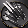 Набор столовых приборов Folk отличается своим оригинальным дизайном. Каждый прибор имеет характерные ручки черного оттенка, украшенные светлыми точками-заклепками, что придает им винтажный или кантри-стиль.