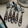 Набор столовых приборов Tree отличается своим оригинальным дизайном. Каждый прибор имеет характерные ручки теплого коричневого оттенка, украшенные светлыми заклепками, что придает им винтажный или кантри-стиль. Этот набор станет выразительным акцентом на вашем столе и придаст уют любой сервировке.