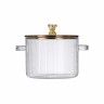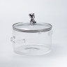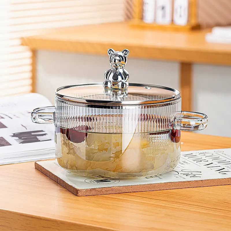 Прозорі стінки каструлі дозволяють стежити за процесом приготування їжі, не піднімаючи кришку, що сприяє збереженню тепла та аромату страв. Ергономічні скляні ручки забезпечують надійний і зручний хват, а кришка, що щільно прилягає, утримує пару і вологу, створюючи ідеальні умови для приготування різноманітних страв. Особливою прикрасою цієї каструлі є ручка кришки, виготовлена у вигляді ведмежатка, що додає виробу оригінальності та чарівності.