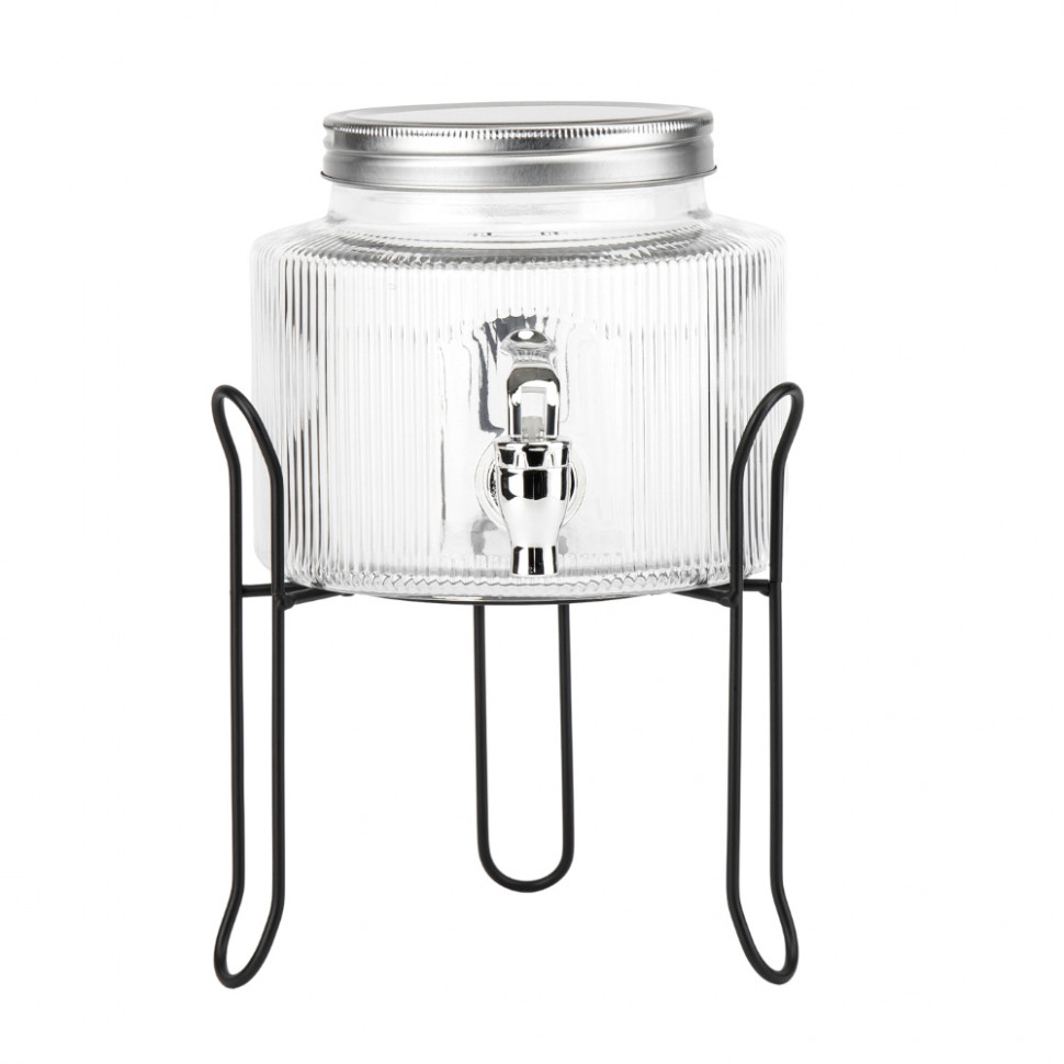 Скляна лимонадниця з кришкою на металевій підставці — це стильний і практичний диспенсер для напоїв, який ідеально підходить для подачі лимонаду, соку, холодного чаю чи води. Завдяки рифленому склу вона має елегантний вигляд, а герметична металева кришка забезпечує збереження свіжості напоїв. Вбудований краник дозволяє легко наливати напій без необхідності нахиляти ємність, що робить її зручною у використанні. Металева підставка додає стійкості та естетики, роблячи цю лимонадницю чудовим доповненням до сервірування на вечірках, весіллях або просто для щоденного використання вдома.