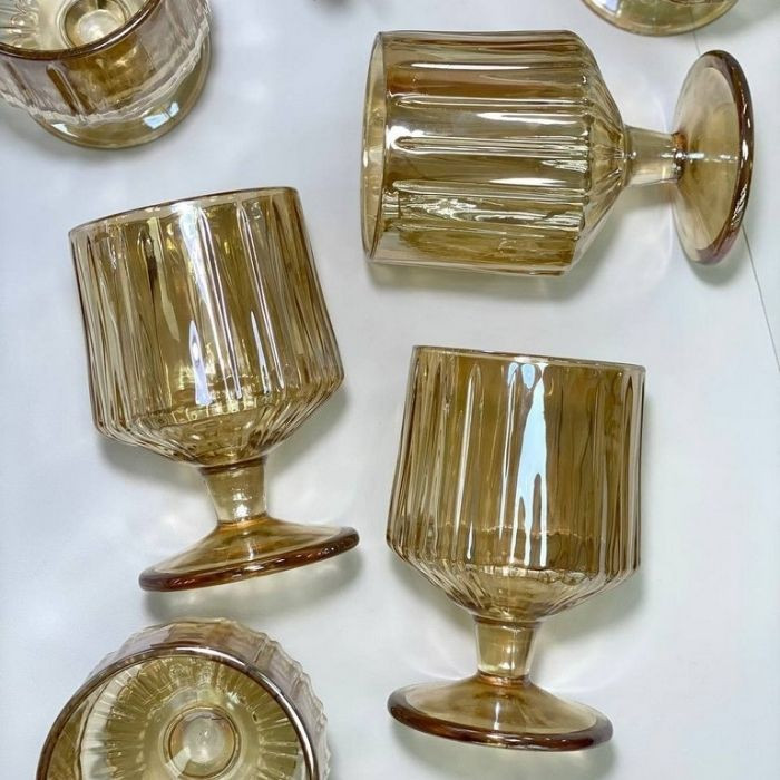 Додайте елегантності до вашого сервірування з келихами Amber Duke. Виготовлені з якісного скла в теплих бурштинових тонах, ці келихи поєднують в собі ретро-шарм і сучасний дизайн. Рельєфна поверхня створює приємну гру світла, а зручна ніжка забезпечує комфортне тримання. Обʼєм 220 мл ідеально підходить для води, вина або коктейлів. Прекрасне рішення для стильного щоденного користування або святкового столу.