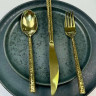 Набір столових приборів Danmark Golden додасть розкоші та вишуканості вашому столу. Кожен прибор виконаний з металу з ефектним золотистим покриттям та має ручки з унікальним "кованим" або текстурованим візерунком. Цей дизайн робить набір ідеальним для святкових сервірувань та особливих випадків, підкреслюючи урочистість моменту.