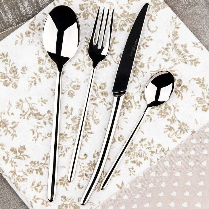 Цей елегантний набір столових приборів "ALASKA", виготовлений з високоякісної нержавіючої сталі, складається з 24 предметів, розрахованих на 6 персон, та поставляється у презентабельній коробці. Кожен елемент набору – столові виделки, ножі, столові ложки та чайні ложки – демонструє характерний для колекції "ALASKA" мінімалістичний дизайн з гладкою, відполірованою поверхнею та витонченими, злегка звуженими ручками без зайвого декору. Цей набір ідеально підходить як для щоденного використання, так і для створення вишуканої атмосфери під час святкових обідів, а також може стати чудовим подарунком.
