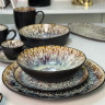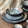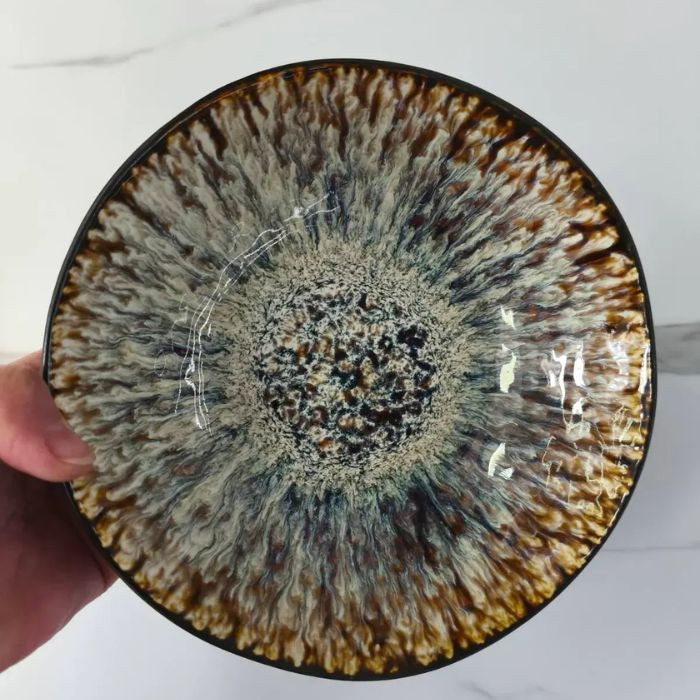 Цей салатник з колекції "Паноптікон" меншого розміру є стильним та практичним доповненням до вашого столового посуду. Внутрішня поверхня салатника прикрашена унікальною реактивною глазур'ю, характерною для серії "Паноптікон", з ефектним візерунком зі світлих та темних вкраплень, що створює відчуття ручної роботи. Зовнішня сторона виконана у стриманому темному кольорі, що вигідно підкреслює красу внутрішнього декору. Салатник чудово підходить для подачі індивідуальних порцій салатів, закусок або десертів.